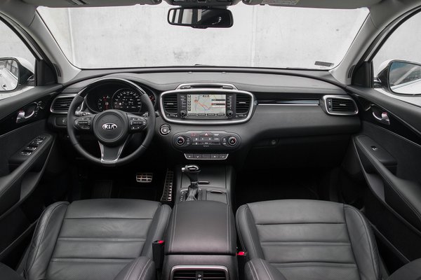 A Kiákkal kapcsolatban néha felmerül, hogy erre vagy arra az autóra hasonlít, de a Sorentónál nem érzek ilyet. Talán az utastérben az a lakkfekete félkörív, ami az ajtópaneleken indulva végigfut a szélvédő alatt, egy kis Insignia-dézsavü, de mivel teljesen más szögből látja az ember, igazából nem üti ki a szemet. Amúgy egy tök hagyományos, modern kivitelű, normál műszerfal néz az emberre, jó puha felszínnel. Még az is hihető, hogy bőrrel varrott, de nem: erre csak akkor döbbentem rá, amikor fotóztam a varratot. Oké, ez picit ciki, de őszintén, ez a művarrás szebb, mint a Toyota Auris bőrös műszerfala, pedig azon igazi a cérna.
