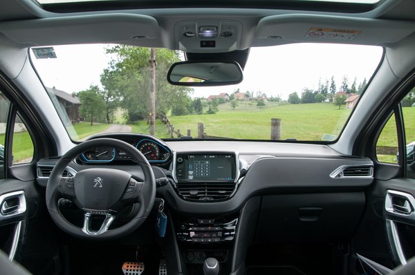 Ízlés dolga, de a műszerfal és a középkonzol izgalmasabb látvány, mint a VW Polóé, egyedül a brutálisan vastag A-oszlop zavaró, ettől nagyjából lehetetlen kinézni oldalra egy szűkebb kereszteződésből. A fűtéskapcsolóktól eltekintve igyekeztek a lehető legtöbb funkciót a középső kijelzőre költöztetni. Az előző változathoz képest hatalmas előrelépés a kezelőfelület, igaz ez a használhatóságra és az esztétikumra is. Sokkal jobb a helyzet, mint a 308-asban, ahol még a szellőzés beállításait is a kijelzőn kell megadnunk.