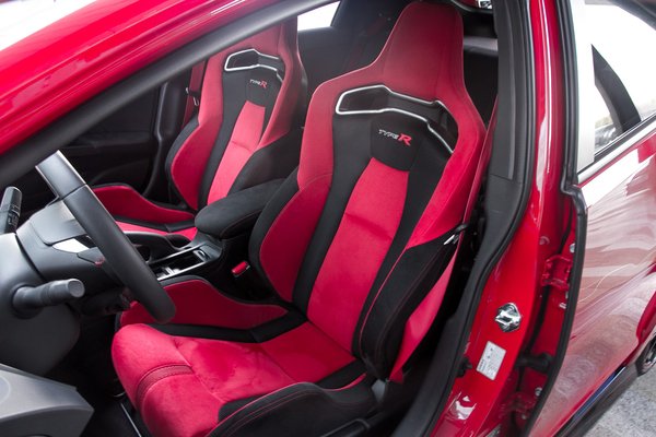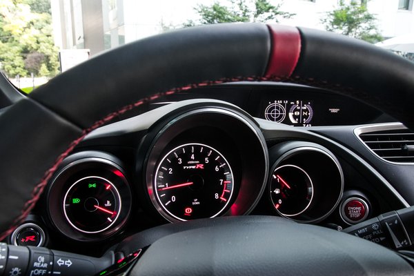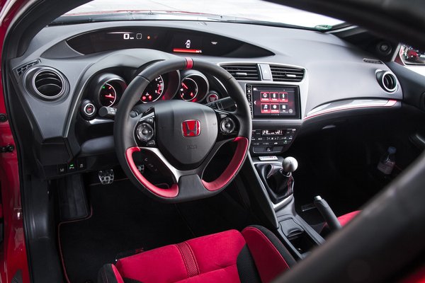 Ilyen belteret is csak ők mernek rajzolni. A kétszintes műszerfalhoz, amelyen a kormányon keresztül őskonzervatív mutatós órákat látunk, fölötte pedig egy nyolcvanas években megálmodott űrhajó monokróm digitális kijelzőjét, sehogy sem passzol a kétdines lyukba bepattintott mediamarktos érintőképernyő, a klímapanelnek megint tök más a stílusa, ahogy a szellőzőrácsok is kívül trendin kerekek, középen pedig szappantartó-szerűek, mint húsz évvel ezelőtt. Szélsőséges eklektika dulakodik előttünk, de ezt mind örökölte a Type R, ahogy a kormányt is, csak belevarrtak egy kis piros bőrt.