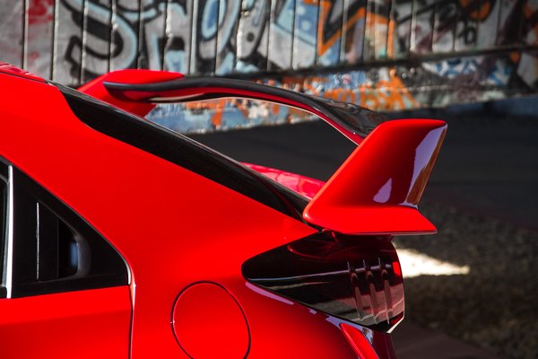 Ma nem sikkes a turbó; egy hólyagosan felnyalt matrica nem sok, annyi se jelzi a legtöbb turbós autónál a feltöltő jelenlétét. Az új Civic Type R-en, az első turbós R betűsön, a Honda első, európai lakosok számára is elérhető, teljesítményre kitenyésztett utcai turbós harcosán egyedül a motor műanyagburkolatán, a nagybetűs Earth Dreams alatt, szemérmesen, alig láthatóan karcolták oda, hogy VTEC turbo. Pedig ha ránézünk erre a japánsportautó-karikatúrára, a gigantikus műanyag-orgiára, ami elhatalmasodott rajta, kötelező lett volna egy-két nagybetűs, piros TURBO felirat. A homlokára, a seggére, az oldalára, mindenhová. Nem lett volna szabad kihagyni. Ez nem az a 2015-ös turbó, amitől féltünk, hogy bekerül a szent Type R-be. Ez egy 1985-ös turbó, kívül-belül.