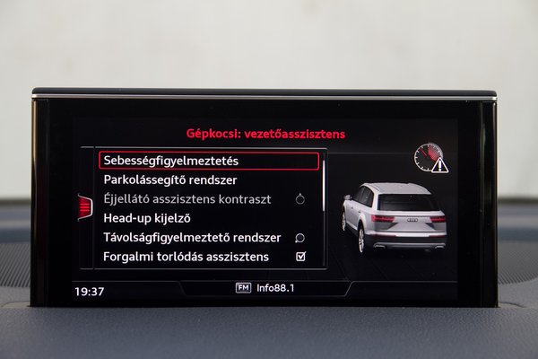 És tanulnia kell. Rohadt sokat – mármint a Q7 beállítgatását. Szerencsére a menürendszer magyar nyelvű, ami nem evidens még ma sem a harmincmilliós kocsiknál. Ha az ember rászánja magát, egészen emberbaráttá tehető az Audi összes vezetősegítő beavatkozása, sőt, az ember akár már az indexelésre is rászokhat, ha nem akar állandóan bicepszből küzdeni a sávtartó automatával.