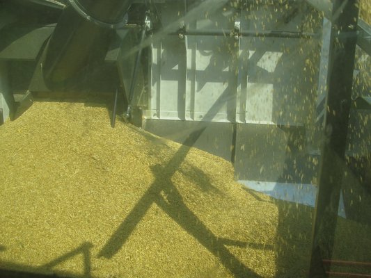 Közben nagyon kell figyelni, mert földet foghatunk, vagy elakad a túl sok anyag a ferde felhordóban, ilyenkor meg kell állni egy-egy pillanatra. A szalmát nem egyszerűen kiszórja hátul a kombájn, hogy majd feldolgozza egy bálázógép, hanem szecskázva fújja ki, talajerő-utánpótlásnak, ezt jól látni a hátrafelé néző kamera képernyőjén. A fülke hátsó ablakán a pedig magtartályra látni, szépen telik, 11 köbméternyi fér bele, árpából hat és fél tonna. Mellénk jön a pótkocsis traktor, kinyújtjuk az ürítőcsigát, és már zúdul is át a termény, másodpercenként 110 liter. Megy minden, mint a karikacsapás.