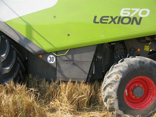 A második körben jól látszik az előző menet nyoma. A széles, kis nyomású Michelin gumik minimális talajtaposást okoznak, viszont olyan jól kapaszkodnak, hogy sáros földön állják a versenyt a gumilánctalpas kombájnokkal. A keréknyomások figyelemmel kísérhetők egy kis képernyőn, még az is látszik, hogy a napos oldalon mindig magasabb egy kicsit. A kombájnnak nincs egyéb rugózása, csak a gumikerekei, de így is nagyon simán halad. Emelkedőtől nem ijed meg: összkerékhajtású.