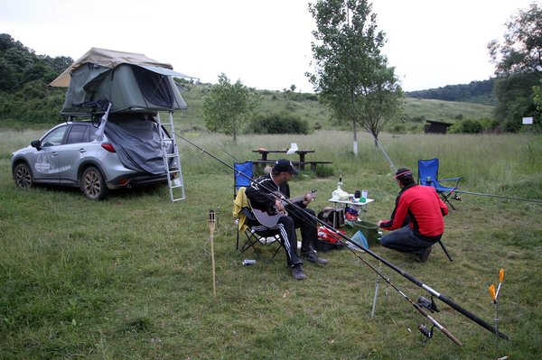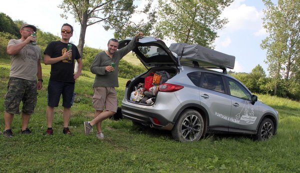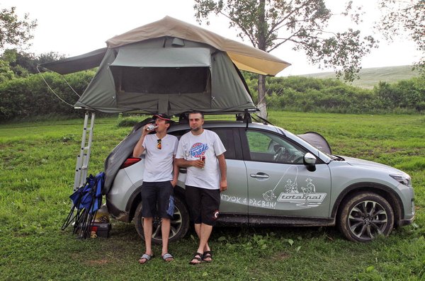 Kapóra jött a pickup 4x4.hu ajánlata, akik egy ideje már nyomták a csengőt egy tetősátorral, én pedig kapva-kaptam rajta, elvégre hogy horgászni megyünk, nem jelenti azt, hogy a nyakig érő gumicsizmában ácsorgunk egy hétig valami sebes folyású hegyi patakban. Ráadásul a horgász is ember (általában, bár van, aki sikeresen rácáfol erre), úgyhogy ha már kilépünk a komfortzónából, akkor azért próbáljunk belőle átmenteni annyit, amennyit csak lehet. Egy sátor kijár, a tetősátor pedig olyan horizontokat nyitott meg előttünk (mert természetesen nem egyedül mentem), hogy kár lett volna kihagyni. Így került a tízmilliós Mazda tetejére némi fejvakarás után a sátor, amit nemes egyszerűséggel csak cimbalomnak hívtunk, mert vízhatlan tokjában teljesen olyan volt.