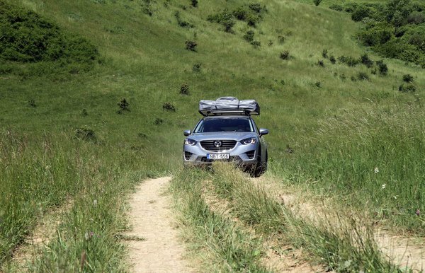 Utazni vele kellemes, dübörgő szélzajra számítottam, de a legnagyobb sustorgást paradox módon a gyári tetősín jobb oldali műanyag burkolata keltette, az összecsomagolt sátor egyedül kanyarokban éreztette hatását, de a CX-5 futóműve alapból elég feszes oldalirányban, plusz az összkerékhajtás is besegített, így egyáltalán nem volt rémísztő, sőt, kifejezetten csendesnek is mondanám.