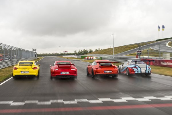 Úgy, hogy ott álltak azok az autók, melyek – és ezt ők maguk mondták – a Cayman és a 911-es kínálat csúcsát adják. Joggal vethetnék fel, hogy nana, ott a Turbo S, az 560 lóerős, 700 Newtonméteres katapult, igazuk is lenne, hiszen jelenleg nincs jobban gyorsuló és nagyobb végsebességet elérő 911. De ez most versenypálya, és itt egy kicsit más a fontos. Ide alacsony önsúly kell, és hátsókerékhajtás. Na meg iszonyatos know-how, amivel elérték, hogy a 60 lóerővel gyengébb GT3 RS mindössze két tizeddel gyorsuljon rosszabbat százas tempóig (3,3), hátsókerékhajtással, szívómotorral.