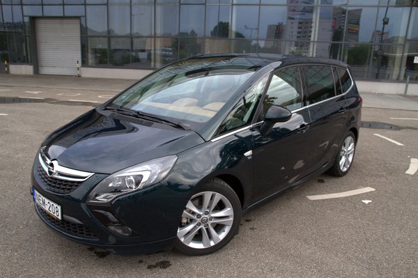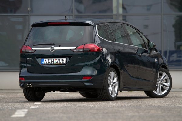 Kívülről még elviszi az orrán a bumeráng-forma és az OPC-csomag, az Opel formatervezői részlege megemberelte magát az utóbbi években, és aránylag jó munkát végeznek. Nyilván lehetetlen elmaszatolni, hogy egyterű és doboz, de amit lehetett, megtettek. Az OPC-kiegészítőket ügyesen elszórva, szép felniken, kicsit talán mélyebbre is ültetve, ráadásul ebben a sötétzöld metálban jól néz ki. Pontosan úgy, mint egy dolog, ami aránylag gyorsan képes tetőig pakolva leszáguldani a családdal az Adriára. Igaz, a friss konkurencia (Picasso, Espace) mellé állítva beszürkül, de ez ízlés kérdése, nem ez a legnagyobb baja.