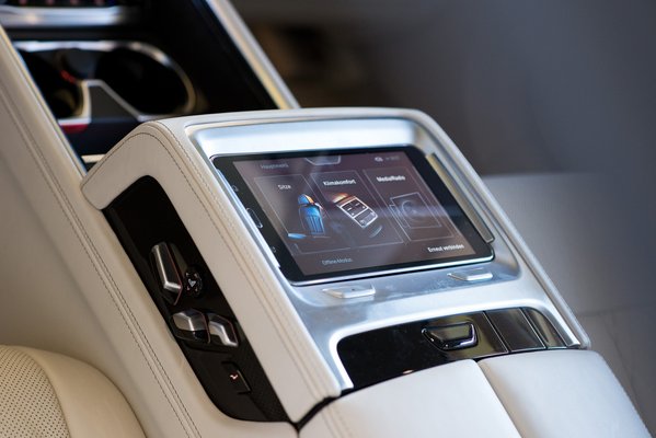 Az Executive Lounge a hátsó üléshez rendelhető dőzs-csomag – hátrébb dönthető a támla és felrakható a lábunk, gombnyomásra. A középső könyöklő tetején egy Samsung tablet. A koreaiak is rájöhettek, miről szól a luxus: eszelősen túl kell árazni a terméket, és máris elfogadják a felsőbb körökben. A portugáliai sajtóbemutató luxusszállodájának luxuslakosztályihoz meg LG Nexus telefon tartozott. Az autóipar egyelőre arra van rágörcsölve, hogy a nemzetközi bemutatóra a fedélzeti elektronika működjön Iphone-nal, de ennek úgy látszik, vége. A hátsó tabletet kis szervómotor adja ki, ha kézből vezérelnénk, felszereltségtől függően az ülés beállításait, a klímát, a fitneszt vagy a hifit, de a műszerfal is megjeleníthető a főnökhelyen, sebességgel, fogyasztással. Az első ülésekhez tartozó középső könyöklőben van indukciós telefontöltő: csak belenyomjuk a résbe a nyomorult kínai androidos szaromat, és kábel nélkül tölti: világít a két led. A korszak persze még átmeneti, mert a BMW Iphone-t is adott a tesztautókhoz, de azt csak egy megfelelő tokba helyezve lehet indukciósan töltögetni.