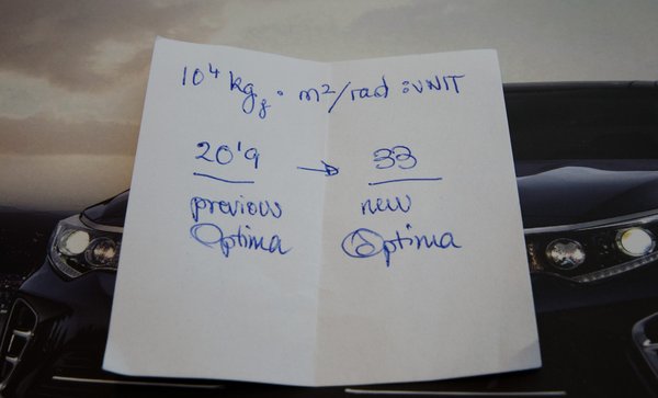 A torziós merevség 50%-kal nőtt, bár amikor ezt kissé sokallva megkérdeztem a francia előadót, mi a mértékegység és a konkrét számok, nem tudott mit mondani, később pedig enyhe sértettséggel nyújtott át egy cetlit egy kisebb és egy nagyobb hülyeséggel. Az egyik, hogy mint látható, neki a tízezer az tíz a negyediken, a méterrúd pedig rögtön egy négyzetméteres, talán mert közben rákapott a hatványkitevők mámorára. De a számok: 20,9 helyett 33, tehát 210 tonna helyett 33 tonna súlyt kell akasztanunk a méterrúd végére, ami elvileg a futómű bekötési pontjainál rögzül, ekkora erőtől csavarodik a kasztni 1 radiánt. Az egy órás tesztút alapján nehéz megítélni, de biztos így van, csak már az előző Optima is eléggé egyben volt. Sokkal több nagyszilárdságú acélt használtak, abból is a továbbfejlesztett változatot, a vázszerkezet felében ilyenek vannak. És persze az is simán benne van, hogy ugyanazt játsszák, mint egykor a Volkswagen két Golf-generáció között: ha eggyel több lengőkar kerül a hátsó futóműbe, a mérés sajátosságai miatt már önmagában ettől nőni fog a vázszerkezet torziós merevsége. A vázszerkezet egyébként 8,6 kilóval lett könnyebb, maga az autó viszont a maga másfél tonnájával nagyjából az iparági átlag.