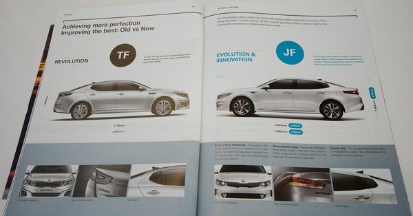 Ájkonik, mondja közben a spanyol előadó az Optimáról, de ennél kevésbé ikonikus autót nem nagyon tudnék mondani. Szép, de visszafogottan. Új, amúgy észrevehetetlen csúcsok jelentek meg a lámpatesteken, a hátsó lámpákat szépen széthúzták, gyakorlatilag mint az ezredforduló utáni Hyundai Sonatán. Ezekkel együtt az Optima is mintha az utóbbi tíz év trendjét követné: a modellváltás inkább néz ki óvatos faceliftnek. Ez egyébként nagyrészt igaz, a platform nem új, csak erősen átdolgozták. A tengelytáv és az autó egy centivel hosszabb és magasabb, 2,5-tel szélesebb.