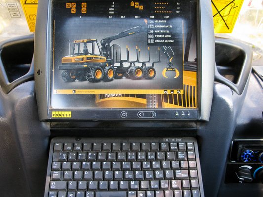 Mumusnak tűnhet a tolatás egy ilyen masztodonnal, mégsem az, hiszen voltaképpen nem is tolatok. 180 fokkal megfordítom az ülést, és, némiképp furán, ekkor kerül a szemem elé a nagy képernyő, rajta a Ponsse Buffalo ábrájával és számadatokkal. Alóla hajtható ki a komplett billentyűzet – ez már a 21. század. Ott is vannak pedálok, és a gép érzékelte, hogy mostantól arra van az előre, még az irányváltó kapcsolót sem kell használni. Nem húzzuk, hanem toljuk a gép hátsó részét, ami sokkal egyszerűbb, mint mondjuk utánfutós autóval tolatni. Igaz, nem jól látok magunk elé, de kisegít egy kamera képe a jobb oldali kis monitoron. Megy ez, remekül.