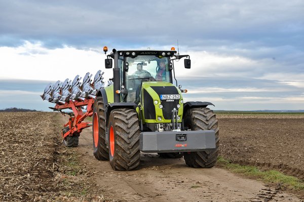 Jelen esetben messze nem lesznek kihasználva a képességei. Közepesen kötött csak a talaj, és ez a hatos eke meg sem kottyan a traktornak. Számításom és József bemutató pilóta, illetve Róbert gazda véleménye szerint nagyjából félteljesítménnyel dolgozik a motor, miközben a szántás minősége szempontjából legjobb 8,5 km/órát tartja a sebességrögzítő. Korántsem optimális tehát a gépkapcsolat, aminek az az oka, hogy a demonstrációs országjáráson bemutatott Claas Axion most egy helyi ekével dolgozik, amilyen épp kéznél volt. Ha vásárlás lesz a dologból, valószínűleg venni kell majd egy nagyobb ekét is a traktorhoz, hogy gazdaságosan legyen üzemeltethető az árában szuperautókkal vetélkedő erőgép.