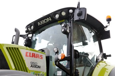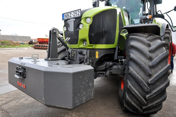 Ezekkel a hatalmas kerekekkel nehézsúlyú a Claas Axion 950: 13 tonnás, ám a vonóerő fokozása érdekében a kerekekre szerelt, és az első függesztőn magával vitt acél pótsúlyokkal együtt már 18 tonnát nyomhat. Három és fél méter magas, öt és fél hosszú, szélessége három méter körüli (a gumiabroncstól függ), tehát jóval túllépi a közúti járművek 2500 milliméteres megengedett maximumát. Egy behemót. Ráadásul egy 12 vasú eke van ráakasztva, szóval ne nevessük ki azt, aki borzadva megtagadja, hogy elinduljon vele.
