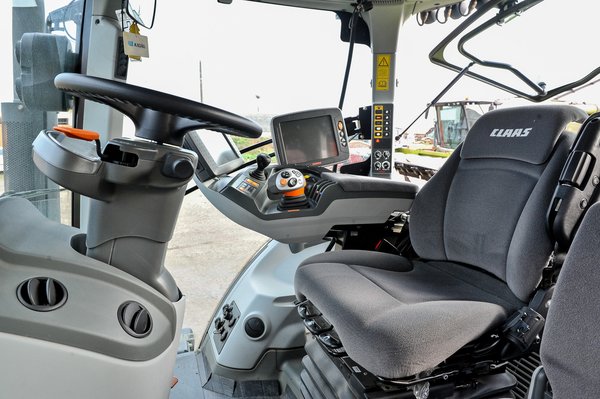Beszállás helyett inkább felszállásról beszélhetünk: hat acél lépcsőfokon mászunk fél emeletnyit. Központi zár nincs, de minek is: csak egy ajtaja van a traktornak, üveg az egész, és nagy erővel kell becsapni, hogy összenyomja a porzáró tömítést. Két ülés van, ezek a társadalmi egyenlőtlenség jegyében születtek. A kísérőé elég kicsi, vékonyan kárpitozott és teljesen rugózatlan, viszont hűtőládát rejt, ahová be lehet pakolni a napi elemózsiát és az üdítőt. Igaz, ahogy az erőteljes testalkatú gazda, Róbert említi, több is férhetne bele.