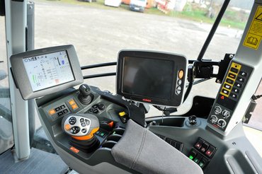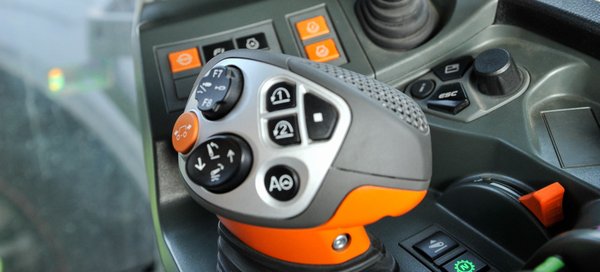 Elindulunk, bal kézzel a kormányon, jobbal a tenyér negatívjaként kialakított, és gombokkal megrakott CMOTION multifunkciós joystickon. A fekete ovális gombot alul megnyomva leeresztem az ekét, aztán egy narancsszínű, kisebb gombbal bekapcsolom a sebességrögzítőt, és már csak kormányozni kell, kicsit rátartva a barázdában, mert a traktor kissé félrebillenve halad. A sor végén sebességrögzítőt kikapcsolni, ekét felemelni, jó nagy helyen egy hurokkal megfordulni, szóval tolatásra sincs szükség, közben a momentán ehhez a funkcióhoz rendelt kapcsolóval átbillentem a 2,4 méter széles sávot felszántó, váltva forgató ekét a másik oldalra, és mehet az előbbi művelet még egyszer, majd akárhányszor.