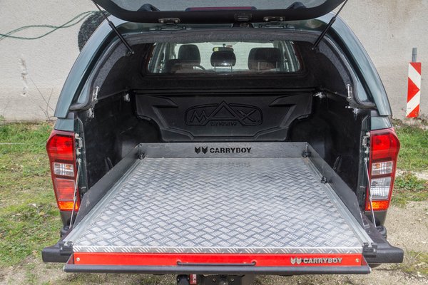 Nagyon professzionális megjelenést ad a kocsinak, akárcsak a másik érdekesség, ami egy kihúzható , C sínes csomagtértálca. Hasonló technikát találunk a tűzoltókon is, így tényleg profinak tudunk látszani, amikor egy laza mozdulattal kirántjuk, és nem derékig a dobozba fejelve vakarjuk ki az elejében lévő cuccokat. Az importőr szerint (ellentétben a csörlővel, amit gyakran csak a látvány miatt rendelnek) ezt a tálcát már tényleg csak a munkaautókba kérik, és érthető módon nagyon népszerű a dolgozók körében. Igaz, némi magasságot veszítünk a raktérből, de egy nem túl magasra rakott raklap még pont ráfér.