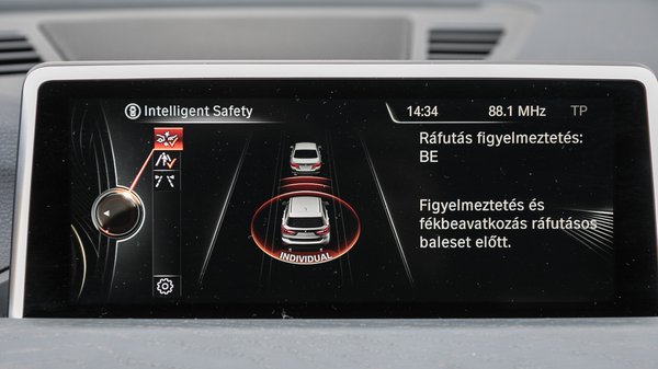 Tetszett viszont a műszerfalon és az ajtókon végigfutó famintázatú burkolat, amely ugyan egyáltalán nem tűnik fának – valószínűleg nem is az, bár ki tudja – viszont tapintásra és látványnak sem bántó, ami nagy szó a zongoralakk- és kályhaezüst-hatású műanyagok korában. A belső tér anyagait gondosan válogatták össze, ahogy a minőségtervezés-órán tanítják: nagyjából mellmagasságig puha és kellemes tapintású anyagokat használtak, csak lejjebb kezd kilátszani a fekete autóipari műanyag, amit valószínűleg minden gyártó ugyanonnan szerez be. Ebbe a változatba a bőr kárpitozáson kívül belefért az autóipar elmúlt évtizedeinek leghasznosabb találmánya, az ablakra vetítő kijelző is. Így aztán menet közben nem is nagyon kellett nézegetnem a műszereket, hisz a sebességet, a navigáció utasításait, a táblafelismerő rendszer jelzéseit és a ráfutásgátló figyelmeztetéseit az utat figyelve is láthattam.