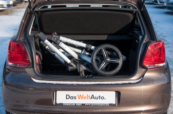 A Polóba csak a kerekek leszerelésével fért be a keret, akkor is passzosan, viszont maradt melette 2x5 wc-papírnyi hely. A probléma az, hogy nem elég mély a raktér, így egy kerék megakad a peremen, és nem lehet lecsukni az ajtót. A mózeskosár ráfér a tetejére, igaz, ilyenkor már a kalaptartó nem csukódik le teljesen, bár ezzel együtt lehet élni.