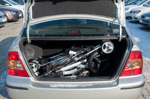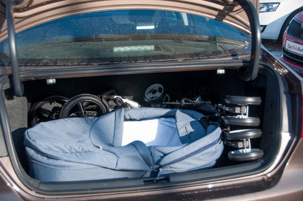 Ismét egy szedán, amely meglepően jó: a nyílás méretével nem volt baj, könnyedén befért a keret és a mózeskosár is, ráadásul az esernyőst hosszában nyelte el a csomagtartó. Könnyedén csukódott az ajtaja, egyedüli gond, hogy érdemi hely így már nem maradt.