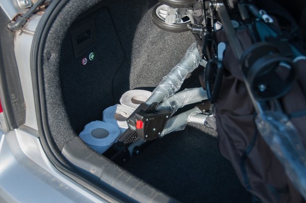 Tartottam az autótól, mert szedán, így sokkal alacsonyabb a csomagtartó nyílása. Ennek ellenére könnyedén befért a keret, de a mózeskosárnak már csak a kerekek leszerelésével jutott hely. Tíz guriga fért be, ezen felbuzdulva megpróbáltam beerőltetni az esernyős babakocsit, de ez már csak erőszakkal sikerült volna, bár a pohártartó leszerelésével talán jobban elfér.