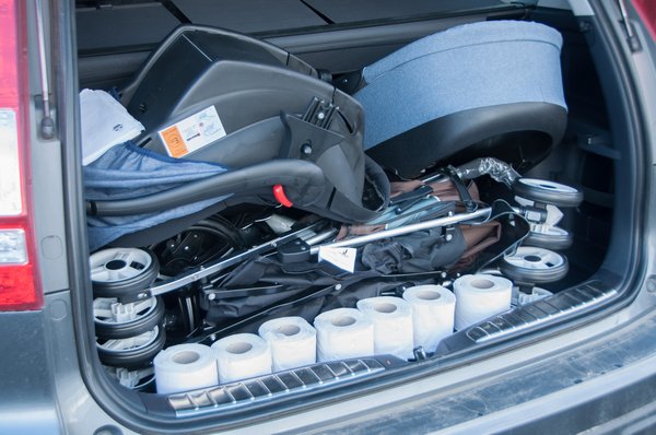 Probléma nélkül csúsztattuk be a mózeskosarat és a keretet is, de az esernyős már csak átlósan, trükközve fért be, ráadásul a csomagtartó lecsukásakor is érezzük, hogy valami valamibe beleér. Ilyenkor a babakocsi flotta már szinte teljesen kitölti a csomagteret, wc-papírt már csak a kerékjárati ív mögé tudtunk elhelyezni, oda is csak három darabot.