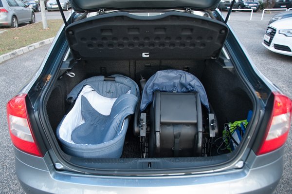 Az Octavia nem hazudtolta meg önmagát, hiszen befért a mózeskosár, az autós hordozó. Ezek ráadásul a kalaptartó kiszerelése nélkül is, ám az esernyő kocsi már csak nélküle fér el. Ennyi holmi eddig egyedül az egyterűekben fért el.
