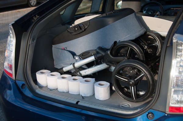 A hármas Prius csomagtere hendikeppel indult, hiszen nem tudják kimélyíteni a hibrid rendszer akkumulátorai miatt. Épp ezért szóba sem jöhet a takaró roló elhúzása, a keret és a mózeskosár csak nélküle fér be. Wc-papír fronton nem olyan rossz a helyzet, egy sorba hat darab fér el a gyerekholmik mellett.