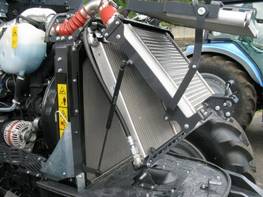 A volán alatt irányváltó kar áll ki, tehát előre és hátra is széles skálán játszhatunk. Az egy bar nyomású, óriási gumikon kissé hintázva jár a traktor, elöl masszív acélalkatrészekből álló független futómű segíti át a terep egyenetlenségein. Ha felemeljük a géptetőt, látszik, hogy a motor, a turbó és a hidraulika egymás mögött sorakozó hűtője legyezőszerűen szétnyitható egymástól, hogy vízsugárral vagy sűrített levegővel könnyen és alaposan ki lehessen fúvatni az összegyűlt port, töreket. Átgondolt konstrukció benyomását kelti az egész, látni, hogy komoly tapasztalatkincs van mögötte.
