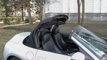 A ponyvatető teljesen automatikus, tehát kézzel nem kell semmit akasztgatnunk, mindent elektromotor csinál, ráadásul gyorsan: a teljes nyitáshoz alig több mint 7 másodperc kell. Ezzel 2002-ben az elsők között volt, a Porsche Boxsternek 11 másodpercre volt szüksége. A tető belső kivitele is szép; akit csukott szemmel ültetnek be, az azt fogja hinni, hogy fekete tetőkárpitos, keménytetős autóban ül. Ráadásul menet közben is csendes az utastér, nincs akkora szélzaj, mint a kabriókban.