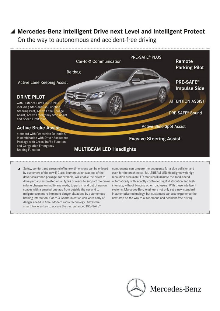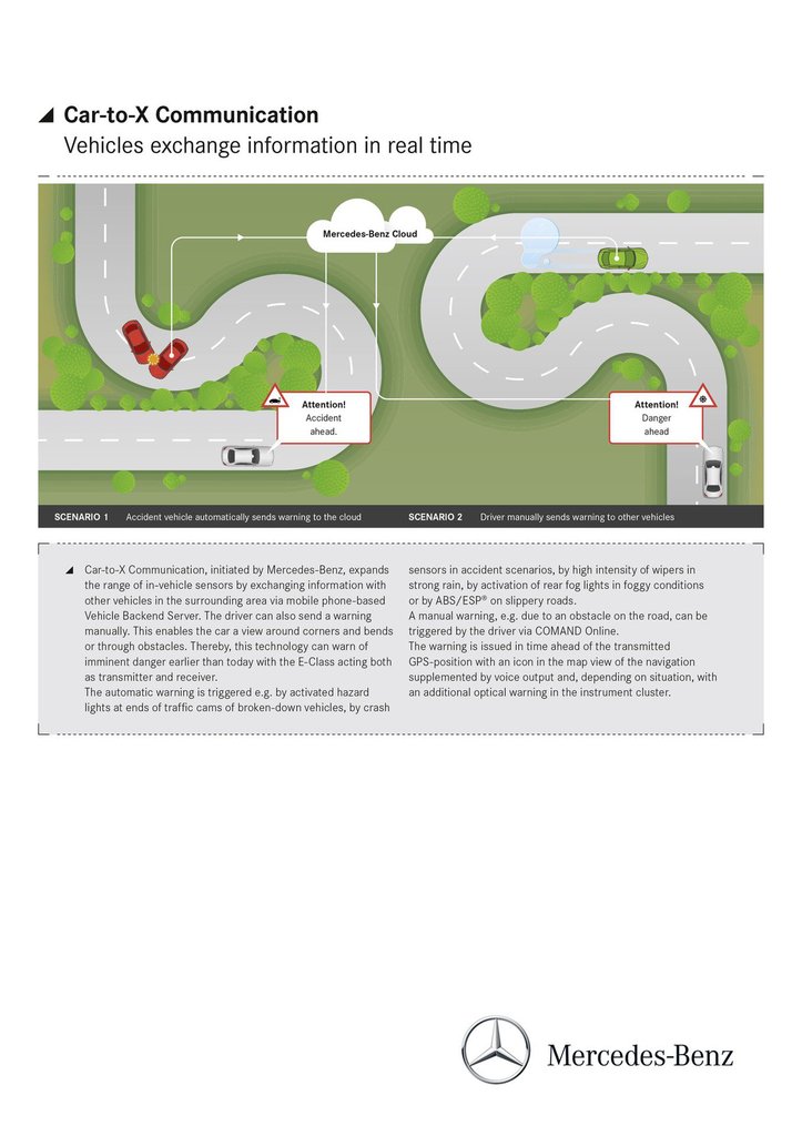 Az E osztálynál a világon elsőként vezetik be a mobiltelefonnal összekötött (más kocsikba pedig akár utólag is beszerelhető) Car-to-X rendszert. Az autó ezáltal más, hasonlóan felszerelt kocsikkal is tud kommunikálni, s a sok adatot egyfajta biztonsági adatfelhőbe sugározza. Ezen adatok segítségével például belát a kanyar mögé, hogy ott jön-e esetleg szembe másvalaki, de azt is tudja, hogy a bukkanó mögött elromlott autó foglalja el a sávot – s ezt az információt rögtön továbbítja a többi, esetleg távolabb levő Car-to-X-szel felszerelt társának. Hasonló koncepción dolgoznak a Toyota mérnökei, de íme, itt már kapható. Persze, a Drive Pilot még nem veszi át helyünket a volán mögött, mert csak egyetlen percet hajlandó önállóan cselekedni, utána meg kell erősíteni a hitében, hogy ott ülünk a kormánynál, minimum azzal, hogy pillanatra a volán küllőjére tesszük a kezünket.