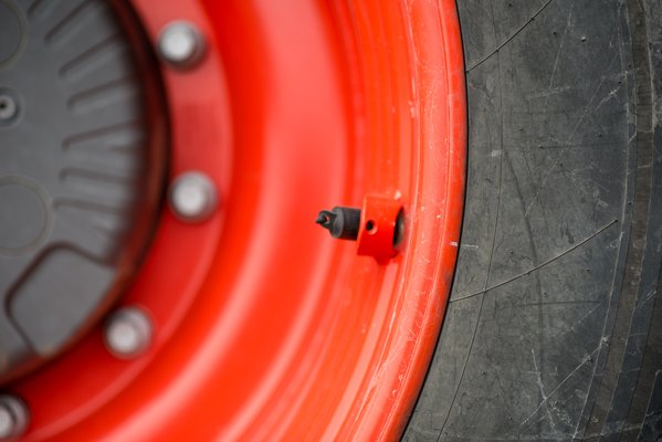 Fontos a keréknyomás is; sáros talajon felfújod a gumikat, jobban belemegy, kapaszkodik, szárazon akár fél bart is kieresztesz, és kisebb lesz a talajnyomás. Ha túlságosan leengeded, lehet, hogy a gumi elfordul a felnin, még ez a spéci Michelin is, ezt demonstrálja a krétajelölés a felnin a szeleppel egyvonalban: ha valaki túlereszti az abroncsot, odébbmászik 10-20 centit, és az már nem jó. Ez a jelölősdi persze nem egy mindennapos traktorosdolog, csak a bemutatókon csinálják, hogy demonstrálják, milyen az, amikor sikerült alultervezni a guminyomást. Hogy tehát ki vesz gumihevederest vagy kerekest, nehéz megmondani; nagyjából vallási kérdés. Mielőtt kimennénk a földekre, hogy gyakoroljuk az összkerekes (három elektrohidraulikus diffizárral) vallást, a traktor mögé kapcsolunk egy talajjavító gépet.