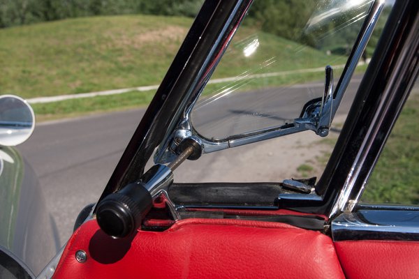 Számomra a legszebb részletek az ilyen kisszériás, formatervező stúdiók által agyondédelgetett autókon mindig a drága, felesleges és bájosan modernnek szánt elemek. Kedvencem itt a pillangóablak (más néven elefántfül) nyitása. Kezded úgy, ahogy a Zsigulin, tehát benyomod a kis pöcköt, felhajtod a zárat, s már billen is. Csakhogy itt lép színre a barnásfekete, bakelit tekerő az ablak első csúcsánál. Ezt serényen forgatva menetes orsót tekersz, amely az egész ablakot, úgy, ahogy van, centikkel kijjebb viszi a karosszériából. Vajon mire volt ez jó? Így lehetett megoldani, hogy huzatmentesen hozza be a szelet? Nem akarták tekerős szerkezetre bízni az egészet, mint a Mercedes, s ez tűnt egyedi megoldásnak? Félek, sose tudom meg. De aranyos.