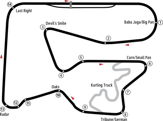 A pálya maga nagyon jó karban van, valamivel több mint három kilométeres hosszával az Euroring és a Hungaroring közé esik, egyértelműen a gyorsabbak közé tartozik. Gyors, hosszú kanyarjai próbára teszik a mechanikai tapadást (az 1. leginkább), a fékek pedig leginkább két, masszív féktávon bizonyíthatnak, melyek közül az első (3. kanyar) az igazán durva, itt még az én fakezemmel is vezetve finoman megkínált ötödikből gangolunk vissza második fokozatig (magyarán elég jó tempóból), a 6. kanyar előtt pedig enyhe lejtőn kell megfékezni, rögtön a horizont után be az erős balosba. A 9. kanyar egy jobb törés – és itt kezd igazán izgalmassá válni –, amelyben gyors, kereszt- és hosszirányú terhelésváltás lép fel egyszerre, hiszen a jobb bekormányzással szinte egyszerre kell megfékezni az autót, így az jobbra is mozdul, orra is bólint, plusz rögtön kapja a balkormányt és a gázt, majd erősen kigyorsítunk és a 11-12.-es kombinációban ugyanezt eljátsszuk fordítva és szűkebben, megspékelve egy erős süllyedéssel a bejáraton.