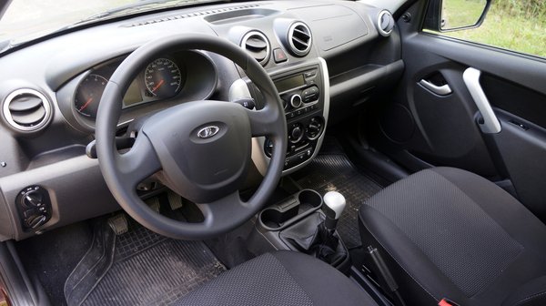Nem tudom, mennyire volt a helyzet magaslatán a marketinges, de – a helyesírási hibáktól eltekintve – nem ő a szakma rutinos rókája. Egy terméket annak jó tulajdonságait kidomborítva kellene reklámozni. Ha pedig van két dolog, ami a Grantára nem jellemző, az az elegancia és az urizálás. A cirill betűs tyesztdrájv felirat feldobja, ad egyfajta komolyságot a megjelenésnek, de csak amíg azt hisszük, a stilizált kormánykerék valójában egy gyalogsági sisak, alatta két irányválasztó karral, mint egy tankban.