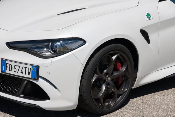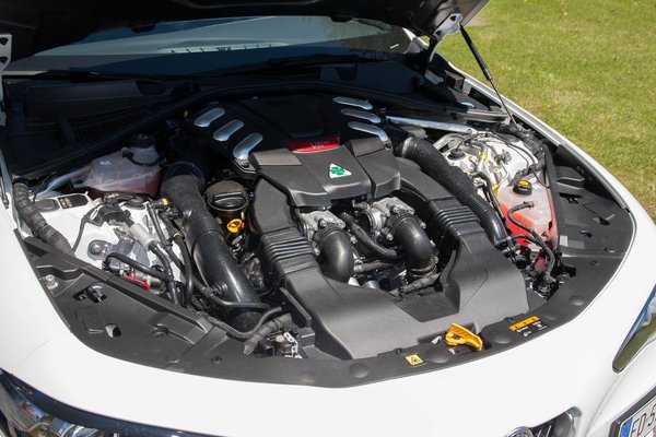 A Quadrifoglio csúcskivitel egy Ferrari 458-aséból háromnegyedére vágott, 2,9 literes motorral zúz – gondoltak a Maserati hathengeresére is, de az nem volt elég erős és kulturált. A 458-as V8-asáról levettek két hengert, s mivel egy V6-osnál nem egyszerű megvalósítani a keresztsíkú főtengelyt, ezért itt normális, csaponként 120 fokos eltolású a forgattyústengely. 510 lóerőt tud és 600 newtonméternyi forgatónyomatékot, s maga a blokk gyönyörű, pókhálószerű alumínium merevítést hord az elején, ami egybefoglalja a segédberendezéseket. Rendelésre karbonfékek, szériában pedig aktív, nyomatékvektorozós diffi jár ehhez a csomaghoz, s a váltó lehet nyolcfokozatú automata ZF, vagy hatfokozatú kézi. 307 km/h-ra és 3,9-es nullaszázra készüljünk.