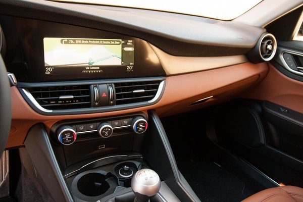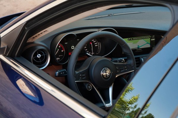 Minden legendás Alfának neuralgikus pontja volt az üléshelyzet, bár személy szerint sose hittem, hogy az olaszok annyira fura testalkatú emberek lennének, amilyennek a magyar autós plebs mondta őket. De tény, mintha majmokra szabták volna az ülés-kormány-pedál háromszöget – hosszú karral, rövid lábbal lehetett csak őket jól vezetni. Az új Giuliában ennek a rossz póznak nyoma sincs, sőt, megkockáztatom, jobb szögben ül benne az ember, mint szinte bármelyik vetélytársban. Kényelmes, bár némiképp rövid és lapos ülőfelületű szék, meredek, közel eső kormány: ez kellemes. Hátul pedig helytengerben fürdik az utas – a lecsapott tető miatt lehajtott fej kell a beszálláshoz, de amikor bent vagyunk, fejnek, lábnak bő a centiméter.
