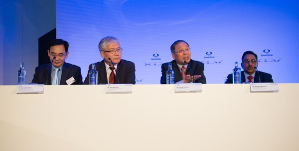 Ja, persze, ezt már ismerem, rajtam nem fognak ki. Előhalászom a fényképezőgépet és kisétálok az első sorba, nehogy kereket oldjon a vezérkar. Balról jobbra Young Han-Son tengerentúli értékesítési igazgató, Soo-Won Lee kutatás-fejlesztési vezérigazgató, Johng-Sik Choi elnök-vezérigazgató, a jobb szélen Sangeev Saksena tengerentúli értékesítési igazgató mereng, mint Duke Ellington a Sophisticated Lady kottája felett. Kikeresem a gépemben a képet, hogy odaugorjak hozzájuk, és megmutassam, tessék, ott a HDMI, de váratlanul megnő a nemzetközi újságírócsapat kérdezési kedve, én meg ott ragadok a kiállított XLV-nek támaszkodva.