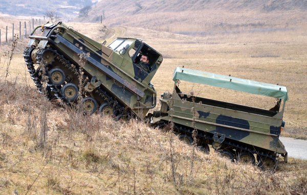 A következő meglepetés a típust nem ismerők számára akkor következik, amikor a kezelőszervekre néznek. Nincsenek botkormányok, csak három pedál, egy kormánykerék és rendes sebességváltó. Amikor Attila átengedte a volánt, az első métereken kicsit óvatoskodtam, hiszen ott volt a tudat, hogy mégiscsak egy lánctalpast vezetek. Ez az érzés azonban hamar elmúlt. Az érzet teljesen olyan, mintha egy kicsit korosabb terepjáróval indultam volna neki a hegyoldalnak. A kormányon csupán egy kis holtjáték érezhető, de semmi nem utal arra, hogy nem kerekeket forgatunk vele, hanem lánctalpat. A váltó meglepően rövid úton jár, a négy sebességet határozottan találjuk meg, nem kell keresgélni. Egyedül talán a kuplunghoz kell magasra emelni a lábunkat, de ez is simán megszokható.