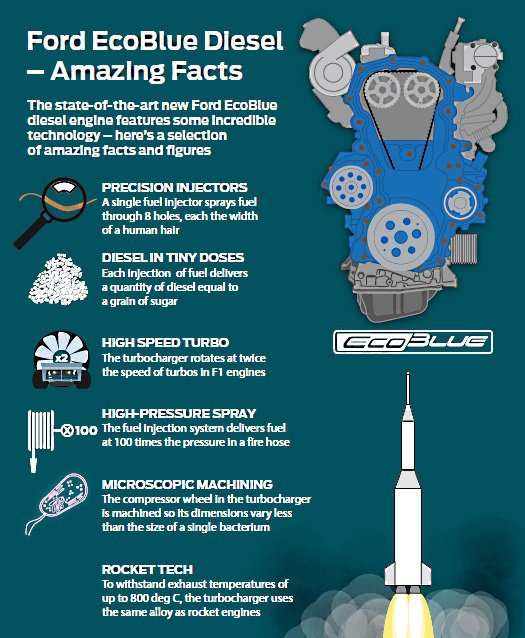 A jól mutató infografikáknak az a nagy előnyük, hogy gyorsan lehet érdekes, bár a felhasználó szempontjából nem különösebben fontos dolgokat elmesélni. Gondolná valaki, hogy egy ilyen unalmas kisteherautóban az a pici kis turbó akár 240 ezret is fordul egy perc alatt – kétszer annyit mint egy F1 versenymotor turbója? És hogy a turbó kompresszorlapátait (amit már nem öntéssel, hanem forgácsolással állítanak elő) olyan apró toleranciával gyártják, hogy a 2-3 mikronos tűréshatárban épp csak elférne egy baktérium? Vagy azt, hogy egy üzemanyag-befecskendező fúvóka összesen nyolc darab, emberi hajszálnyi átmérőjű lukon tolja ki magából nagy nyomással a gázolajat – befecskendezésenként annyit, mint egyetlen kristálycukor-darabka?