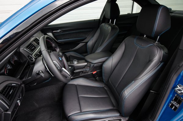 Mielőtt beültem hátra magam mögé, óvatosan körülnéztem, mint parkolás előtt a nők, nem lát-e valaki, aki majd röhögne a bénázásomon, de feleslegesen aggódtam. Előrehajtjuk a támlát, az ülés magától előbbre csusszan, beülök, bent vagyok és kész. Bent a szokásos finom utalások a sportosságra, mint karbonszőttes betétek, mintha maga Farkas Flórián kézműveskedte volna a börtönben. Kék varrások a bőrökön, M-logók itt-ott, ezeken kívül a szokásos fix palatáblával, és az enyhén kusza vonalvezetéssel egyértelműsíti a gyártó, hogy nem én vagyok a célközönsége.