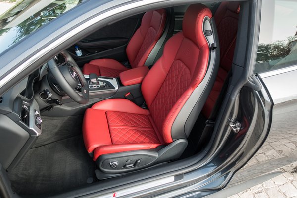 A megvilágosodás akkor jött el, amikor fél napig tartó dízeles közlekedés után sikerült átverekednünk magunkat egy valódi S5-be. Teljesen más világ. Bár az utastér, az ehhez a kemény, teljesen elektromosan mozgatható sportülésekkel is pontosan ugyanolyan szűk, mint az hétköznapi A5-é, de a bordó bőrbelsővel már az első méter megtétele előtt vidámabb benne tartózkodni.