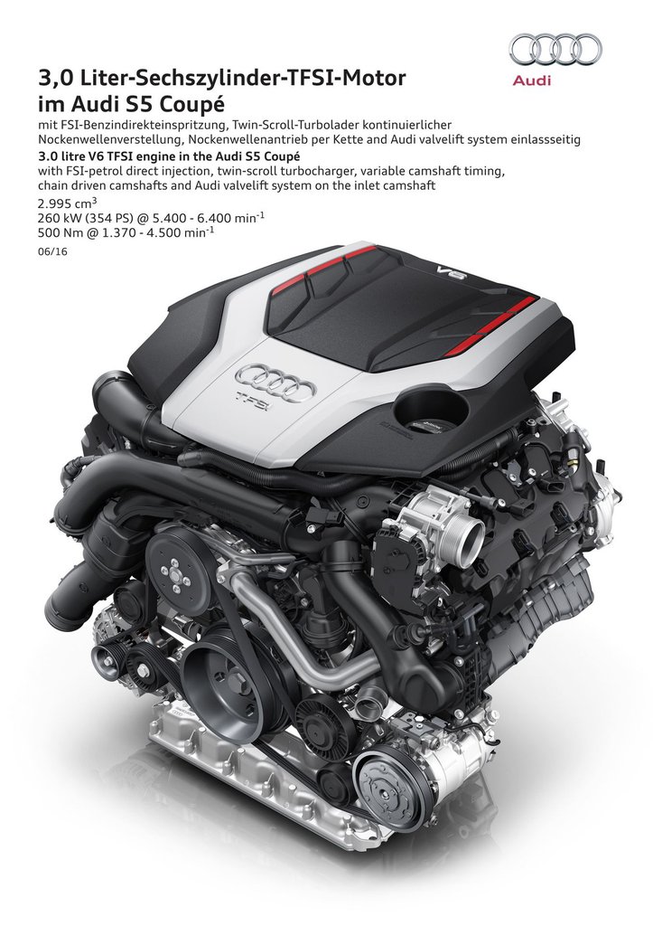 Az S5-höz teljesen új motort készített az Audi. A V6-os közvetlen befecskendezésű blokk 800 alkatrészében különbözik az elődjétől amelynél 14 kilóval könnyebb és kisebb a fogyasztása is. Hengersorai közé kettős megfúvású turbótöltőt szereltek, ez közös öntvényházban lakik a kipufogó leömlőkkel. Az S5 váltója nyolcfokozatú Tiptronic, hajtása pedig természetesen a Quattro, amely a tapadási és hajtási viszonyok szerint osztja nyomatékát az első és hátsó kerekek közt. Valódi csúcsmodell ez, a V8 FSI-vel hajtott, régi RS5 utódlásáról egyelőre egy szó sem esett.
