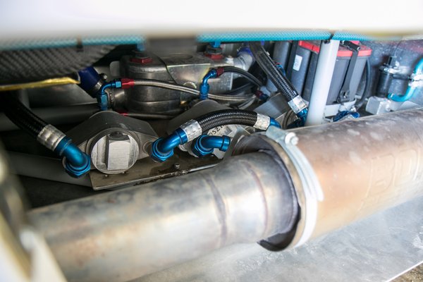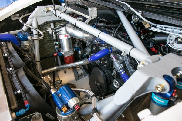A motor nem csak képletesen, valóban a műszerfal alatt van, a pilóta és a navigátor térdei között. Minden a lehetőleg középre csoportosított tömegekről és az alacsony súlypontról szól. A pótkerék az ülések alatt, a 450 literes tank mögöttük kapott helyet. Valahogy úgy kell elképzelni, hogy övvonal alatt van a komplett technika, a sofőr meg egy tetejére csavarozott széken ül. Kis túlzással a V8 egyik hengersorát lovagolja meg. Legalábbis ezt érezni menet közben.