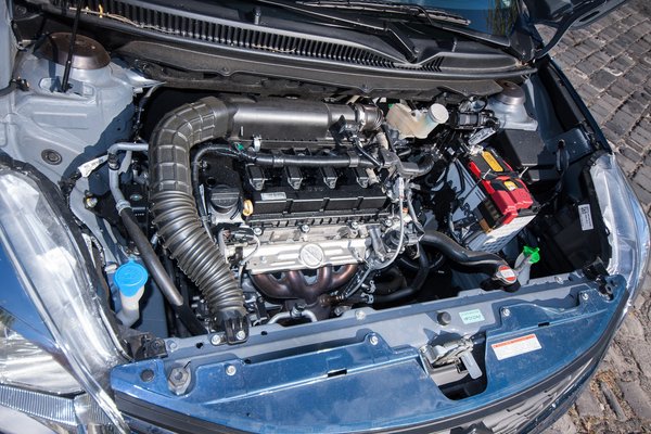 A Baleno a Celerio-fogást veti be, majdnem egy egész mérettel feljebb. Az orrában levő, a kor divatjával szembemenve teljesen fedetlenül hagyott motorja kettős gyújtású, görgős szelephimbájú, rendkívül csekély belső súrlódásokat biztosító bevonatokkal és felületkezelési technológiákkal szerelt. Még a kipufogógáz-visszavezetőköre is vízhűtéses, ami drága autókon szokásos megoldás. Lehet, hogy nincs rajta turbó, de ez egy modern, átgondolt, sokat finomított, drágán gyártható motor, talán nem véletlen, hogy mindenféle turbó nélkül 90 lóerőt tud. Az azért nem kevés.