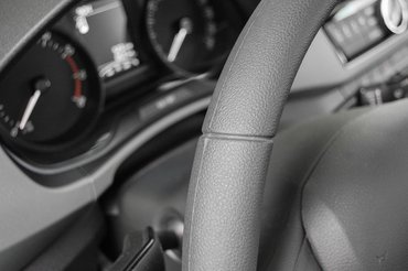 Érdekes a műanyag kormány anyaga, mert nem az a kemény műanyag, mint mondjuk a teljes műszerfalborítás, hanem valamiféle prémium műanyag: kemény, de jó tapintású. Reméljük, nem mállik majd le róla, mint az ezredforduló Volkswagenjeinek a prémium műanyaga.