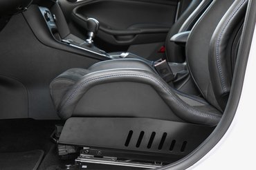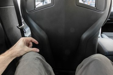 Konfliktusunk akkor éleződött ki, amikor először beültem. Nem, engem egy ilyen autóban nem érdekel a proli beltér, a kusza dizájn, a komor, éjfekete hangulat. De egy magas ülés igen. A feláras, passzentos, héjszerűen vékony, keményen párnázott, négypontos övhöz is előkészített Recaro tökéletes lenne, ha tíz centivel lejjebb lenne. De így magasabban van, mint egy széria Focusban, és a primitívség és a funkcionalitás között egyensúlyozó lemezkonzol fix. Előre-hátra lehet tologatni a széket meg a támlaszög állítható, slussz-passz.