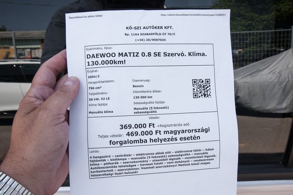 369 ezer forint, amit kérnek érte, de ez még honosítás előtti állapotot tükrözi. Mivel a cinkotai Kő-Szi autókereskedésnél nem saját járműként, hanem bizományban ácsorog a Matiz, nem is tudták megmondani, pontosan mennyiért hozható el, de egy halk „olyan 420 táján, már lepapírozva szerintem meg tudja venni, aki nagyon akarja” elhangzott. Én azt mondom, biztosan 450 alatt lesz az ára, biztosan. Sok ez? Kevés? Hiszen vizsgás Matiz van már 150-180 ezer körül, bár azok még biológiailag, kémiailag és fizikailag igencsak egészségre ártalmas állapotban vannak. Meg aztán: megnézném azt az eladót, aki a jó menettulajdonságokat „jómenet tulajdonságnak” írja, így, mármint hogy egyetlen ilyen tulajdonsága van a kocsinak. Melyik a sok közül? A sebesség? A gyorsulás? A kanyarképesség? Á, az biztosan nem lehet. De egyetlen órányi Matiz-galaxisba való belefeledkezés is óriási szociológiai tanulmány, itt repkednek az „akkut nem adok!”, a „valódi 613 ezer kilométer!” (300 ezer forintért), a „családi okokmiat”, az „azonnal elvihető alkuképes tulajdonostól”, és „hibátlan fris műszaki” stílusban megfogalmazott, emitt antiszociális, amott az írásképesség határát erősen alulról súroló megjegyzések. Jó szórakozás, próbálják ki!