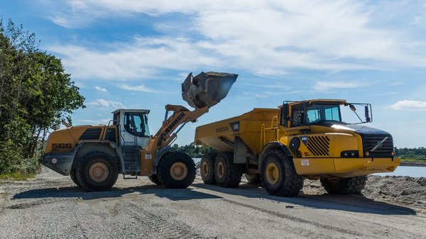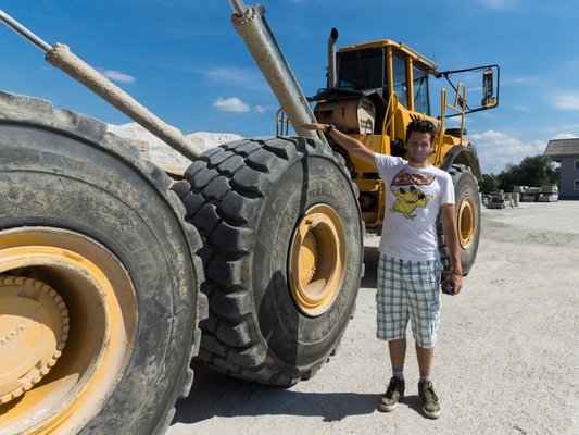 Reinhard szemlélteti is a Volvo napi rutinját: beáll a kotrógép által kitermelt kupac mellé, majd jön a Liebherr homlokrakodó, és megpakolja. Ordas jószág ez is, kanalanként kilenc tonnával rakja a teherautót, vagyis mindössze öt kanálból megtelik. Annak ellenére, hogy a saját súlya még egyszer fent van a platón, nem tűnik kevésbé fürgének, vendéglátóm egy távolabbi lerakót vesz célba: a billentés a katarzis, mindössze 12 másodpercig tart, pedig a 37 tonna kavics a földről legalábbis egy kisebb hegynek tűnik.