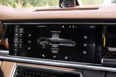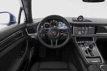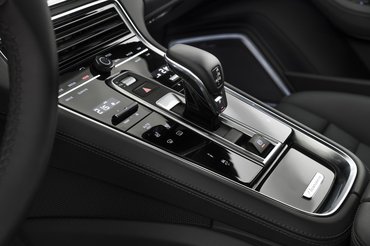 Mélyen huppanunk bele az ülésbe, sportosan támaszt és az autó körbevesz minket. Luxusautóhoz képest teljesen szokatlan ez a mély üléspozíció. A középen velünk farkasszemet néző fordulatszámmérő az egyetlen valódi mutatós műszer a hagyományos elrendezésű Porsche műszerfalon, a másik négy óra imitációs, nagy fényerejű TFT kijelző, amellyel sok információ megjeleníthető, de most a Panamera-sziluetten fut végig a ragyogás. A váltó felett a középkonzolon egy tűéles képű, 12 collos kijelző.