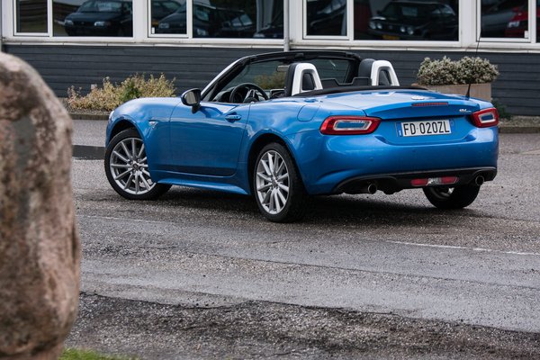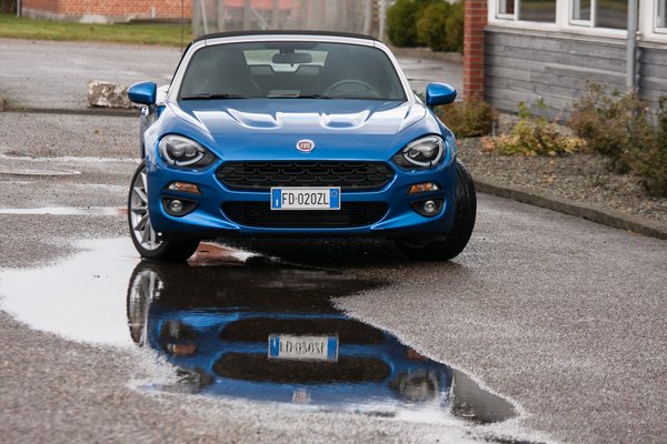Meg persze – mivel a sima 124 Spider az 1,5-ös MX-5 rokona – se feszes sportfutómű, se sperr. Ezért igazán tiszta keresztbemenéseket nem lehet bemutatni a 124 Spiderrel sem (bár én nem próbáltam, mert szakadt az eső, a kanyargós észak-dán utak körülbelül 83 centiméter szélesek, 124 Spider tesztautóból pedig csak egyetlen állt rendelkezésre), a kocsi pedig ugyanúgy, vagy talán még kicsit jobban is bólogat és billeg, mint a kis MX-5-ös, pedig ebben picivel keményebbek a rugók a japán verziónál. Annyira nem rossz érzés ez, az ember így még jobban együtt él a kocsival, de a sportautóságtól ezzel elég messze kerül.